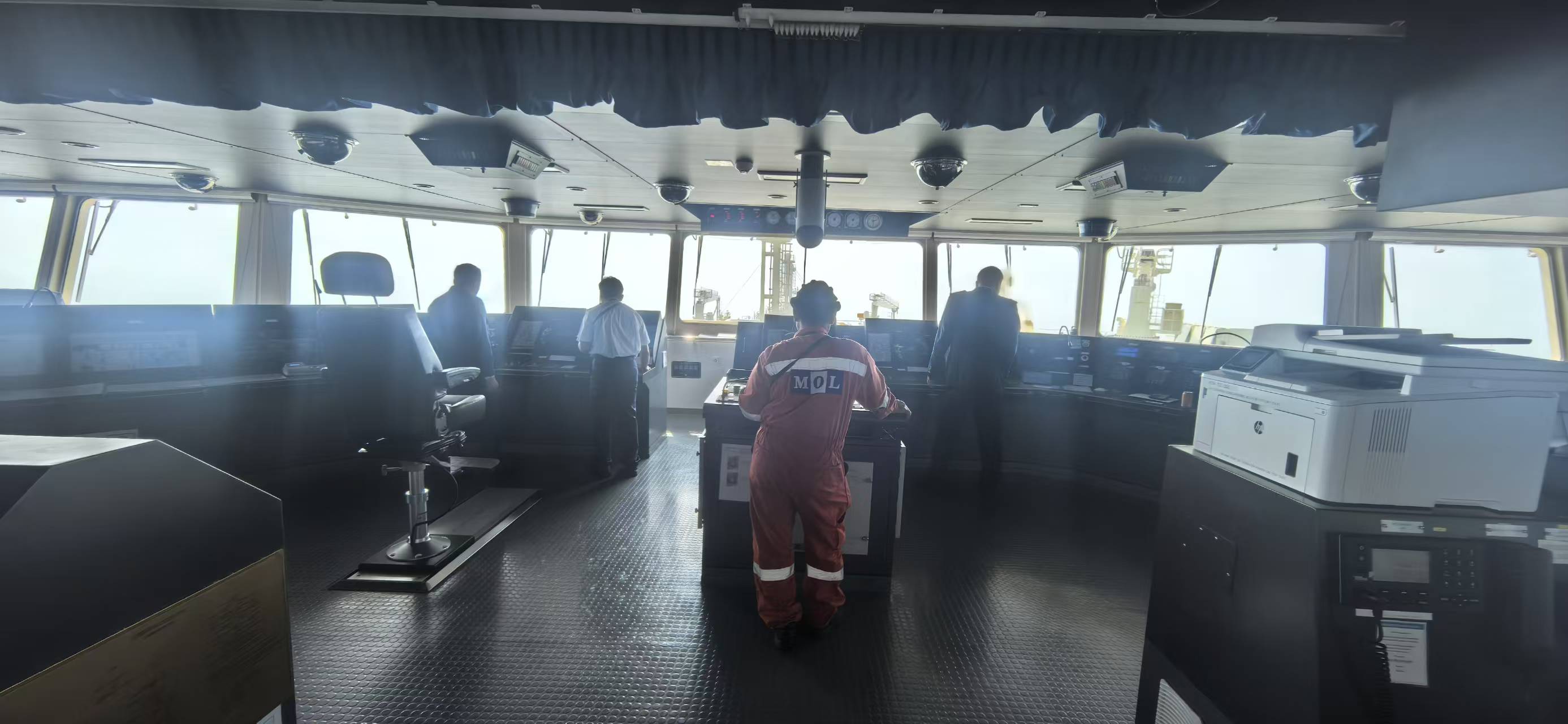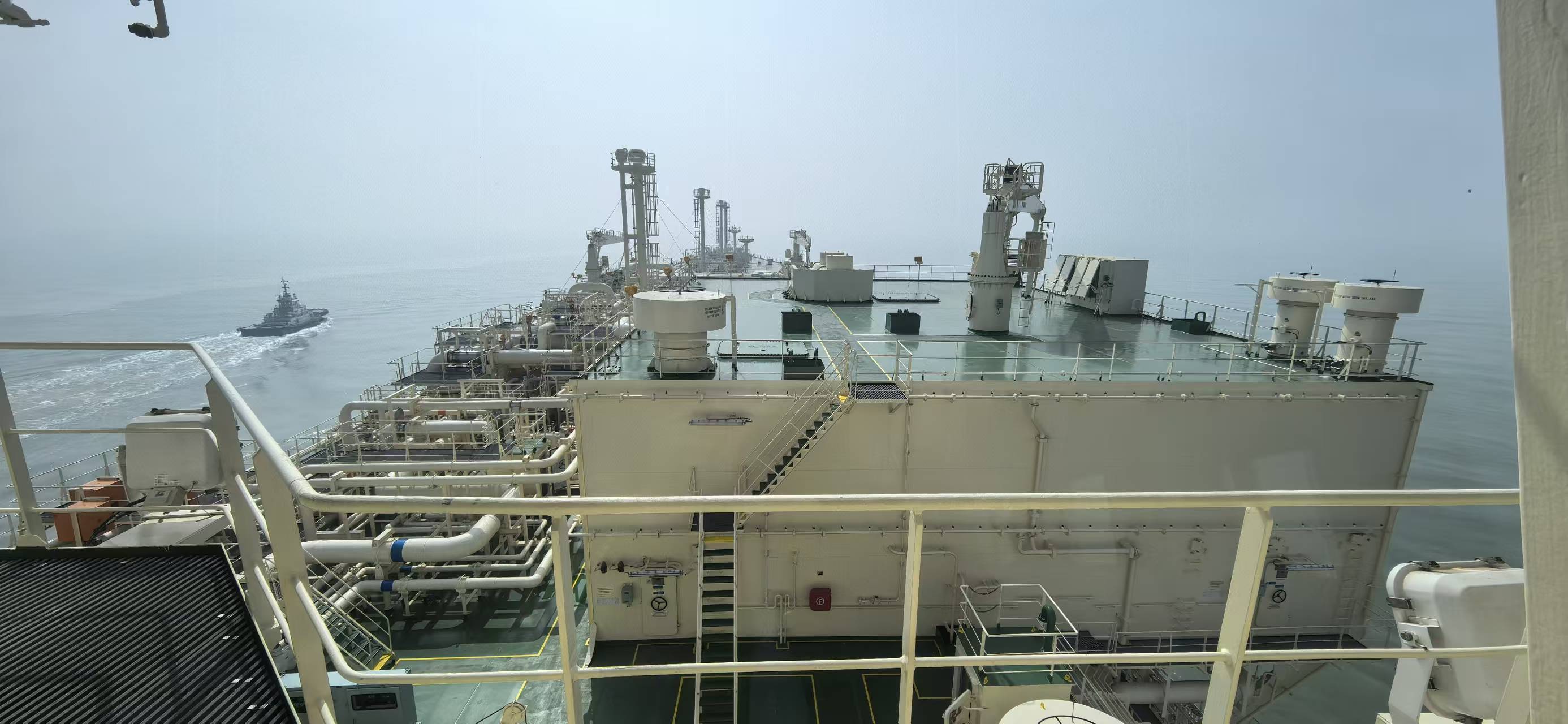 從舷側(cè)視角可見(jiàn),“綠能風(fēng)”輪龐大的主甲板與錯(cuò)綜復(fù)雜的管道系統(tǒng)在薄霧中若隱若現(xiàn),甲板上工作人員嚴(yán)陣以待,隨時(shí)應(yīng)對(duì)突發(fā)狀況。駕駛室內(nèi),三名引航員專注操作,與外籍船長(zhǎng)及駕駛團(tuán)隊(duì)默契配合,完成一系列高難度操縱動(dòng)作。與此同時(shí),護(hù)航拖輪在周圍穩(wěn)穩(wěn)跟隨,為巨輪提供應(yīng)急推力支持,構(gòu)成一幅現(xiàn)代港口高效協(xié)作的生動(dòng)畫卷。