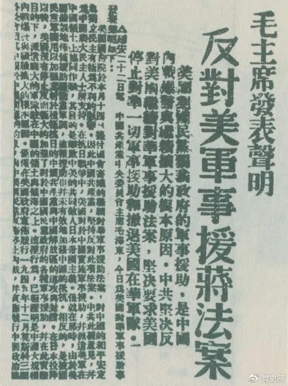 毛澤東以中共中央主席名義發(fā)表《反對美國對蔣軍事援助法案的聲明》。聲明指出:美國國務(wù)院于本月十四日提付國會審議的繼續(xù)對華軍事援助法案,對中國的和平安定與獨立民主有極為不利的影響,因此中國共產(chǎn)黨堅決反對此項法案。中共此種意見,并為中國廣大民主人士所支持。在抗日戰(zhàn)爭中,美國對于中國實施軍事援助,并派遣美軍在中國領(lǐng)土上協(xié)同作戰(zhàn),其目的是擊敗中美的共同敵人日本帝國主義,但就在那時,由于美國錯誤地僅僅援助國民黨軍閥,這種援助也并未有效地加強中國的抵抗,相反地是被國民黨軍閥用以加強其對于積極抗日的中國共產(chǎn)黨與中國解放區(qū)的進攻與封鎖。在日本投降以后,美國沒有停止反而極大地加強了對于中國國民黨政府的各種軍事援助,并在此實際目的下派遣龐大的軍隊駐在中國的領(lǐng)土與領(lǐng)海之上,這種行動已經(jīng)證明是中國大規(guī)模內(nèi)戰(zhàn)爆發(fā)與繼續(xù)擴大的根本原因。美國實行所謂軍事援助,實際上只是武裝干涉中國內(nèi)政,只是以強力支持國民黨獨裁政府繼續(xù)陷中國于內(nèi)戰(zhàn)、分裂、混亂、恐怖和貧困,只是使中國不能實現(xiàn)整軍復(fù)員和履行其對于聯(lián)合國的義務(wù),只是危害中國國家安全獨立與領(lǐng)土主權(quán)完整,只是破壞中美兩大民族的光榮友誼與中美貿(mào)易的發(fā)展前途。在此種現(xiàn)實情況之下,中國共產(chǎn)黨不得不堅決反對美國政府繼續(xù)以出售、交換、租借、贈送或讓渡等方式將軍火交給中國的國民黨獨裁政府,堅決反對美國派遣軍事使團來華,并堅決要求美國立即停止與收回對華的一切所謂軍事援助,和立即撤回在華的美國軍隊。