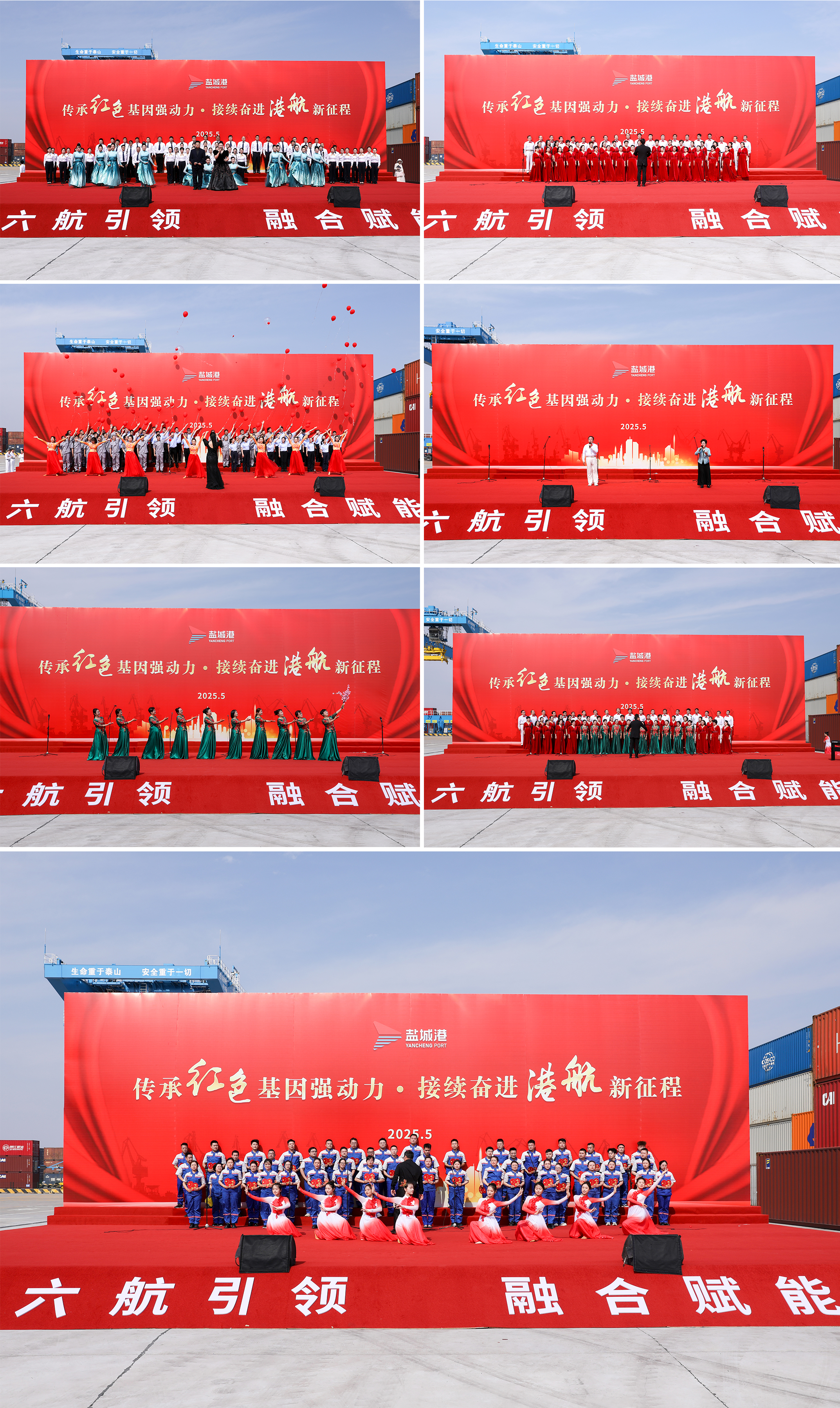 清風(fēng)合唱團(tuán)率先登場(chǎng),他們用激昂的歌聲獻(xiàn)上了《新四軍軍歌》、《壯美延安》、《桃花謠》等紅色經(jīng)典曲目,唱出了新時(shí)代人的赤子情懷。由各單位職工組成的合唱團(tuán)身著工裝,在集裝箱旁縱情高歌?!断蚝3霭l(fā)》青春激昂的旋律與集裝箱裝卸的機(jī)械轟鳴交織在一起,唱響了同頻共振、攜手同行的“奮進(jìn)樂(lè)章”,奏響新時(shí)代鹽城港人共奔美好前程的發(fā)展之歌。