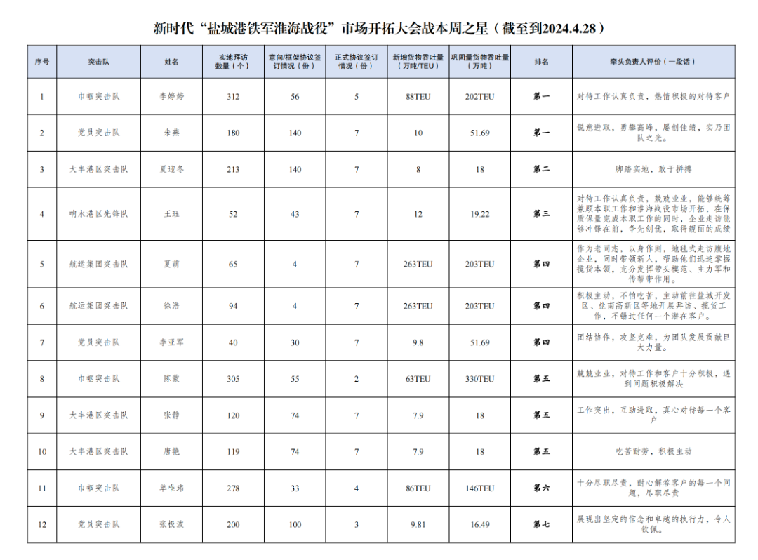 第一名:巾幗突擊隊(duì) 李婷婷(拜訪客戶312家,簽訂意向協(xié)議56份,簽訂正式協(xié)議5份,新增貨物吞吐量88TEU,鞏固量貨物吞吐量202TEU);黨員突擊隊(duì) 朱燕(拜訪客戶180家,簽訂意向協(xié)議140份,簽訂正式協(xié)議7份,新增貨物吞吐量10萬噸,鞏固量貨物吞吐量51.69萬噸)