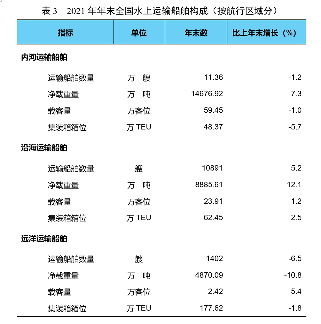 年末全國(guó)擁有水上運(yùn)輸船舶12.59萬艘,比上年末下降0.7%,其中凈載重量28432.63萬噸、增長(zhǎng)5.1%,載客量85.78萬客位、下降0.3%,集裝箱箱位288.43萬標(biāo)準(zhǔn)箱、下降1.6%。