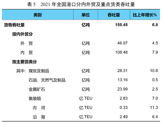 全年全國(guó)港口完成貨物吞吐量155.45億噸,比上年增長(zhǎng)6.8%。其中,內(nèi)河港口完成55.73億噸、增長(zhǎng)9.9%,沿海港口完成99.73億噸、增長(zhǎng)5.2%。完成集裝箱鐵水聯(lián)運(yùn)量754萬TEU,增長(zhǎng)9.8%。