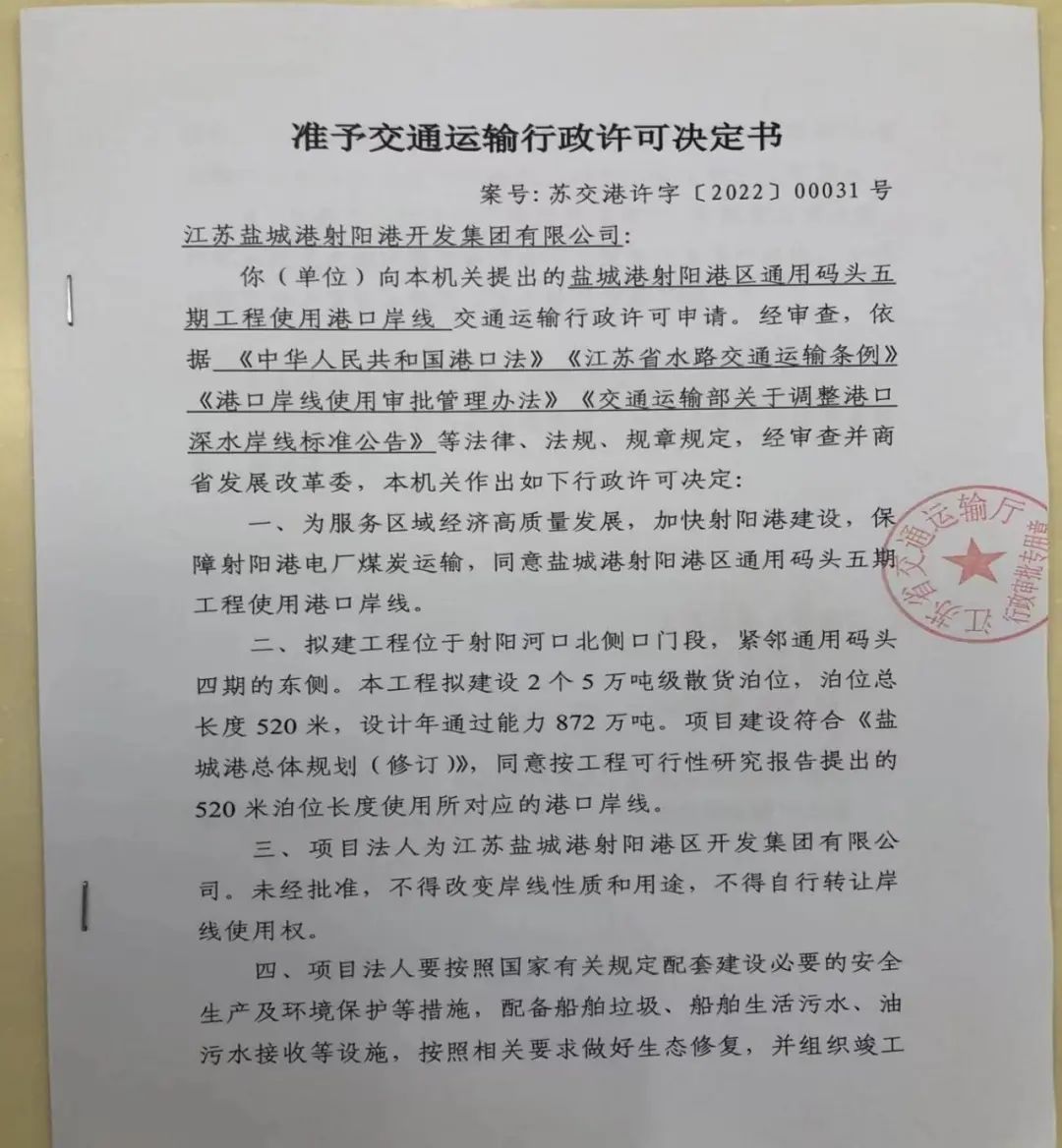 9月16日,鹽城港射陽港區(qū)通用碼頭五期工程岸線取得江蘇省交通運(yùn)輸廳正式批復(fù)。截至目前,該項(xiàng)目前期工可報(bào)告、穩(wěn)評、通航安全技術(shù)報(bào)告、防洪評價(jià)、岸線全部通過批復(fù),這標(biāo)志著項(xiàng)目開工正式邁入“快車道”。