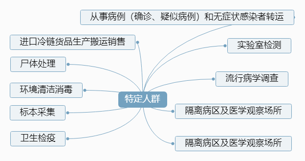 6.“特定人群”:在新冠肺炎疫情期間,從事病例(確診、疑似病例)和無(wú)癥狀感染者轉(zhuǎn)運(yùn)、尸體處理、環(huán)境清潔消毒、標(biāo)本采集、實(shí)驗(yàn)室檢測(cè)、流行病學(xué)調(diào)查、隔離病區(qū)及醫(yī)學(xué)觀察場(chǎng)所、衛(wèi)生檢疫、進(jìn)口冷鏈貨品生產(chǎn)搬運(yùn)銷售等工作的人群。