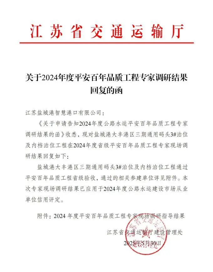 近日,省交通運(yùn)輸廳公布2024年度“平安百年品質(zhì)工程”專家現(xiàn)場調(diào)研指導(dǎo)結(jié)果,鹽城港大豐港區(qū)三期通用碼頭3#泊位及內(nèi)檔泊位工程成功通過,標(biāo)志著鹽城港在省級“品質(zhì)工程”創(chuàng)建領(lǐng)域取得了歷史性突破。