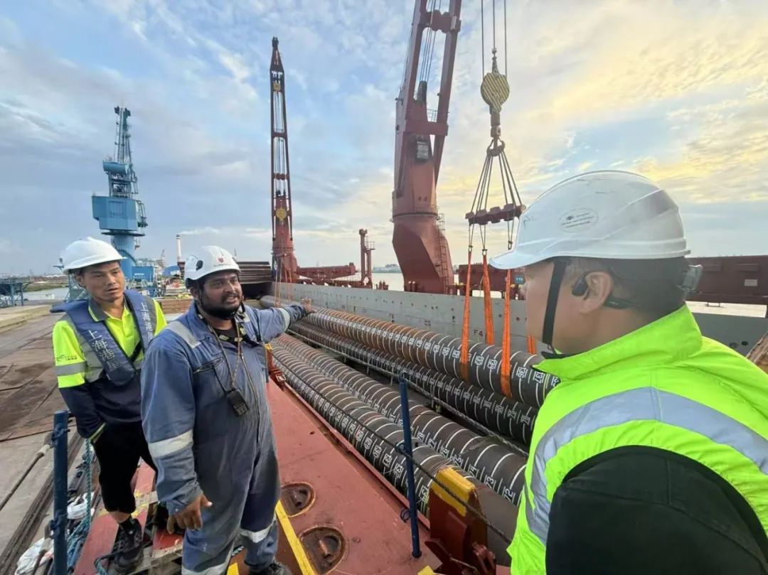 “幸福號”貨輪承載著江蘇天能海洋重工有限公司精心制造的尖端管樁裝備,這些“大國重器”將遠赴中東,為當(dāng)?shù)赜蜌赓Y源開發(fā)提供關(guān)鍵基礎(chǔ)設(shè)施支持。全船共裝載45件管樁及配套鋼結(jié)構(gòu),其中管樁長度普遍超過40米,最長達76.8米,單件最大重量突破377噸,堪稱“海上鋼鐵巨龍”。