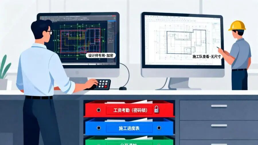 資料分好“保密等級”:重要的圖紙別誰都能看,比如只有設計師能打開帶尺寸的詳細圖,施工隊看簡化版就行;工人的考勤數(shù)據(jù)、工資信息單獨存,設密碼鎖,別和施工進度表混在一起。