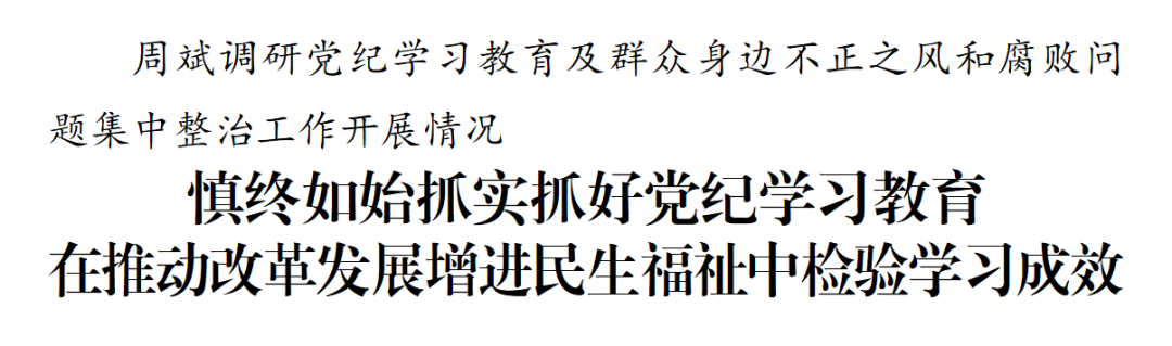 周斌在調(diào)研中指出,黨紀(jì)學(xué)習(xí)教育要強(qiáng)化原文研學(xué),深學(xué)細(xì)悟習(xí)近平總書記關(guān)于全面加強(qiáng)黨的紀(jì)律建設(shè)的重要論述,堅(jiān)持融入日常、抓在經(jīng)常,持續(xù)在深化內(nèi)化轉(zhuǎn)化上下功夫,引導(dǎo)黨員干部更好把遵規(guī)守紀(jì)刻印在心。要強(qiáng)化警示教育,用好紅色資源、鮮活案例和生動(dòng)現(xiàn)場(chǎng),加強(qiáng)正面引導(dǎo)和反面警示,讓黨員干部受警醒、明底線、知敬畏,真正做到知行知止。要強(qiáng)化學(xué)用結(jié)合,堅(jiān)持兩手抓、兩促進(jìn),將黨紀(jì)學(xué)習(xí)教育與整治形式主義為基層減負(fù)、整治群眾身邊不正之風(fēng)和腐敗問題、推進(jìn)經(jīng)濟(jì)社會(huì)高質(zhì)量發(fā)展相結(jié)合,在嚴(yán)格約束下積極擔(dān)當(dāng)作為,切實(shí)把學(xué)習(xí)成效轉(zhuǎn)化為推動(dòng)改革發(fā)展、增進(jìn)民生福祉的實(shí)際舉措,真正讓黨員受教育、發(fā)展見成效、群眾得實(shí)惠。